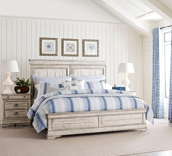 Selwyn by Kincaid balances the ‘best of’ with the ‘what’s next’ in a collection that meets the moment with a timeless charm. Capturing the character of a classic French design, the Louis Philippe inspired silhouettes provide the framework for a more casual approach. The use of genuine solid wood constructed with natural-planked panels gives the Cottage White finish a time-worn and relaxed feel. This mood carries on through the hardware and fabric details of the collection where burnished metal work and understated textures are the seasoning that makes the recipe complete.