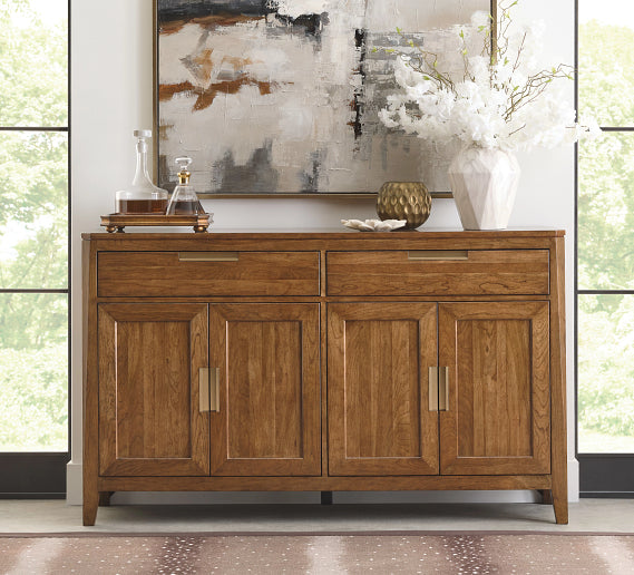 A modern interpretation on tradition made from solid cherry featuring a clean aesthetic. Cherry Park showcases simple lines, smooth, rounded edges, radius-tapered legs, and complementing champagne metal hardware in a rose-gold tone. This collection offers an array of storage features in a warm distinctive look that fits well in any home. In addition to modern features like our adjustable soft-close drawer glides, Kincaid utilizes the best of the old-world construction techniques. Such features include English Dovetails, mortise and tenon construction, floating tops and panels, full dust proofing, and multi-step hand-rubbed finishes.