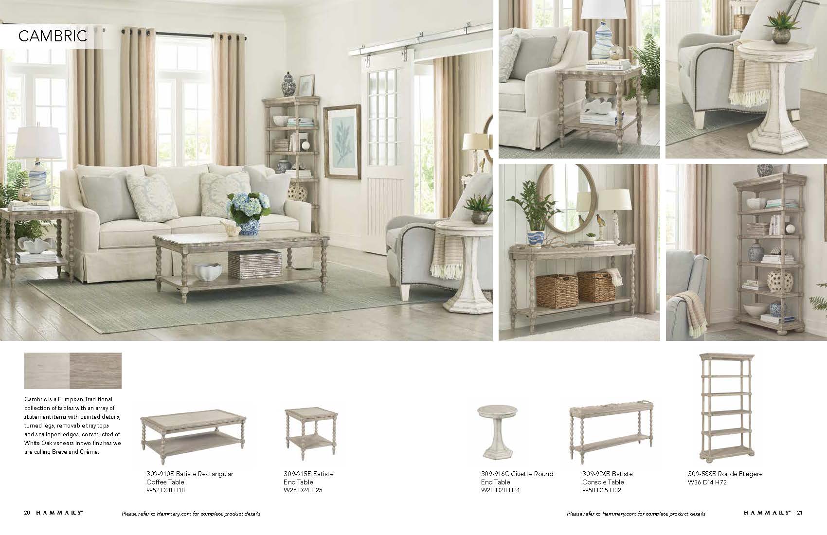 Cambric is a European Traditional collection of tables with an array of statement items with painted details, turned legs, removable tray tops and scalloped edges, constructed of White Oak veneers in two finishes we are calling Breve and Crème.