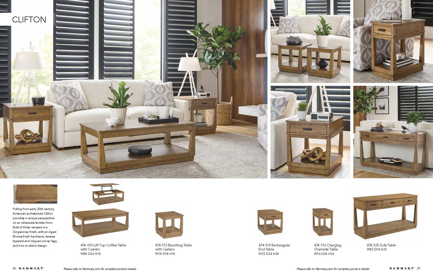Clifton by Hammary brings a clean, collected look that feels at home in both casual family rooms and refined living areas. Thoughtful details like practical storage, scale that suits real homes, and durable finishes make these pieces easy to live with. Use it as a complete room solution or mix individual tables with your current favorites for a layered, custom look.