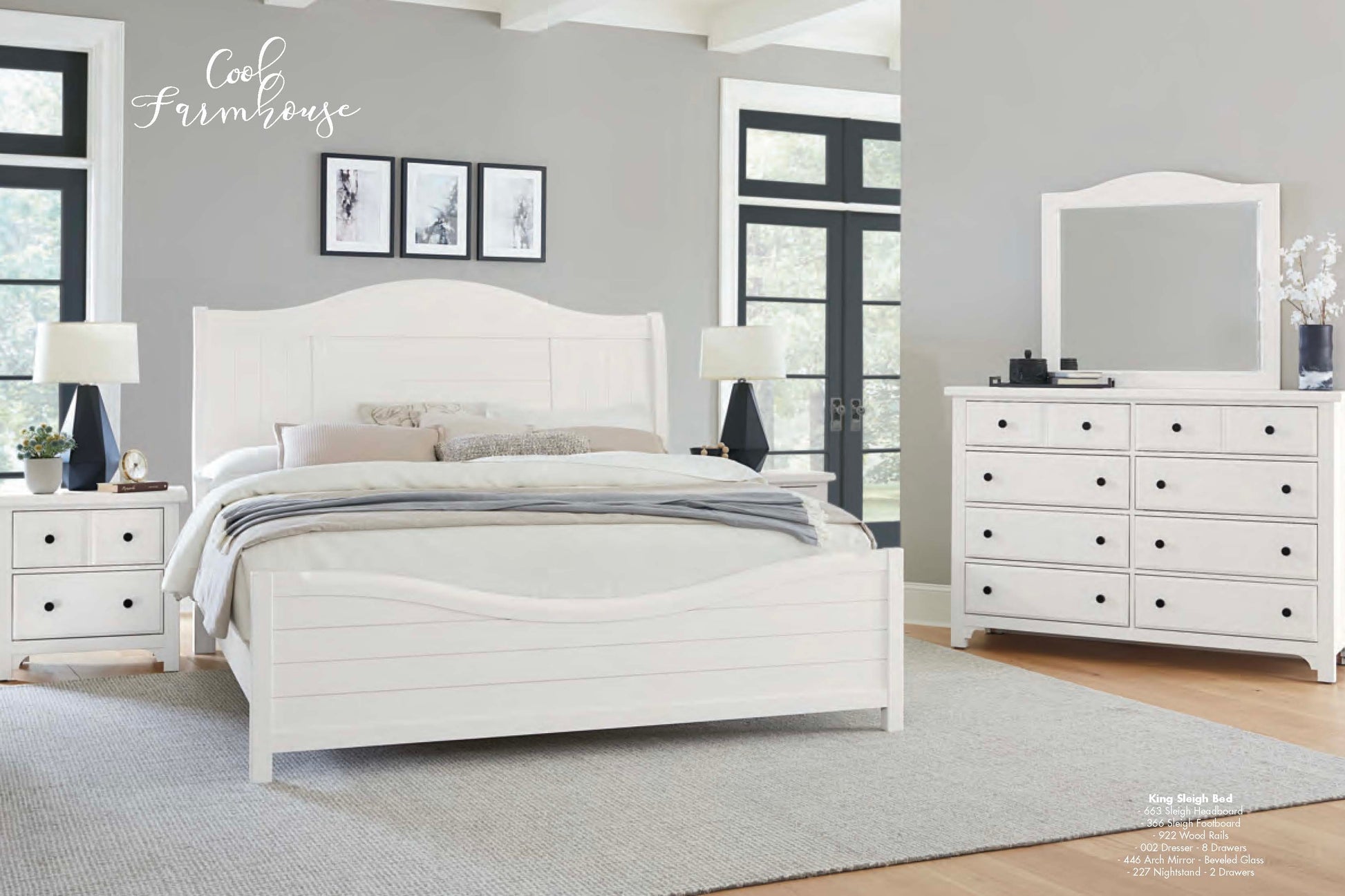 Vaughan-Bassett’s Cool Farmhouse collection blends relaxed farmhouse styling with clean, modern lines for a timeless bedroom look. Pieces like dressers, chests, nightstands, mirrors, and panel or sleigh beds come together in versatile finishes such as Natural CF, Grey CF, and Soft White CF to mix and match across any space. Proudly Made in the USA, the collection emphasizes sturdy construction and everyday durability from an American manufacturer known for quality and value.